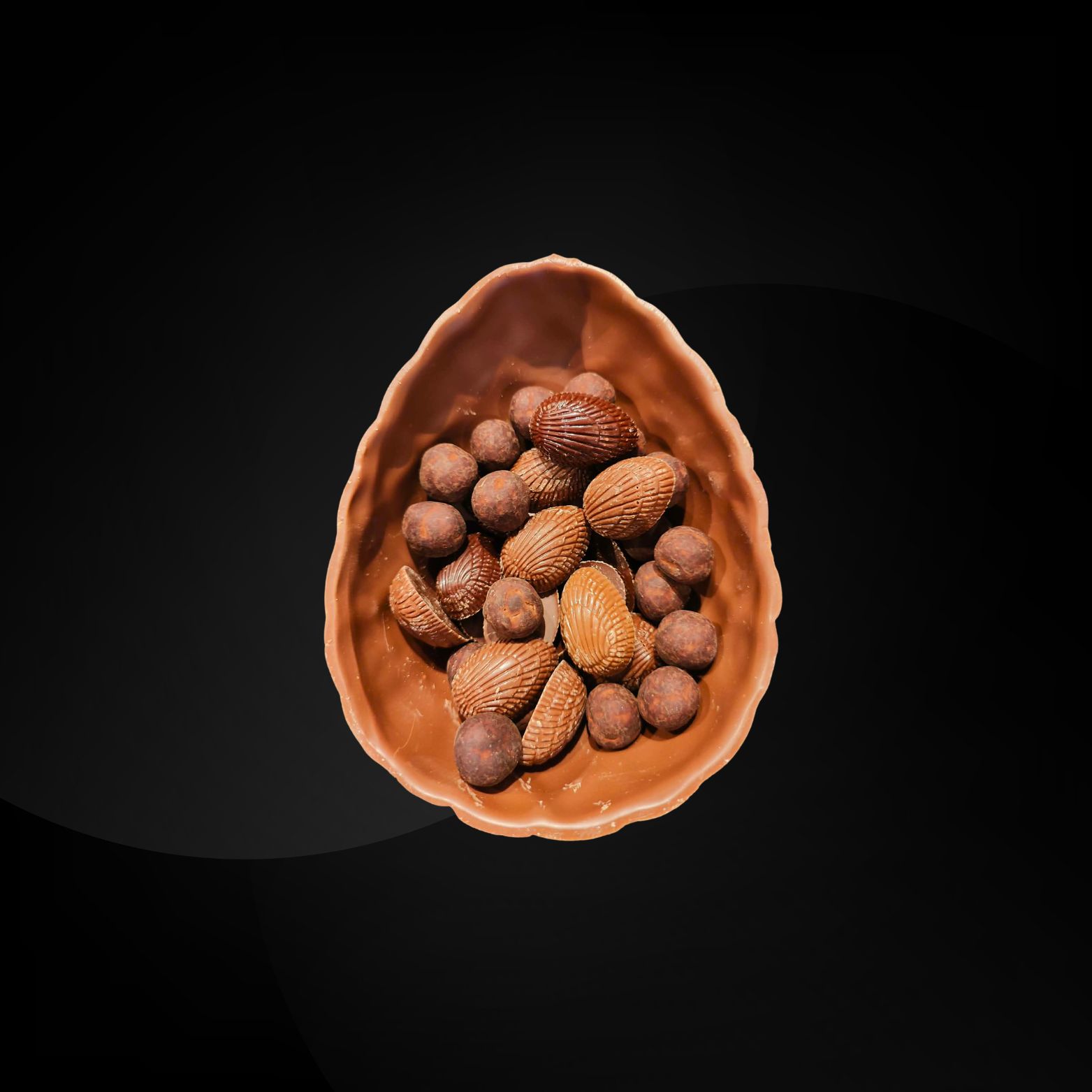 Œuf velour en chocolat noir ou au lait, renfermant un assortiment de ½ œufs pralinés noir et lait, accompagnés de noisettes enrobées de chocolat.
