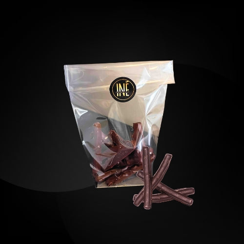 Orange confite, entièrement enrobée de chocolat noir, pour un mariage parfait entre l’acidité fruitée et l’intensité du chocolat.