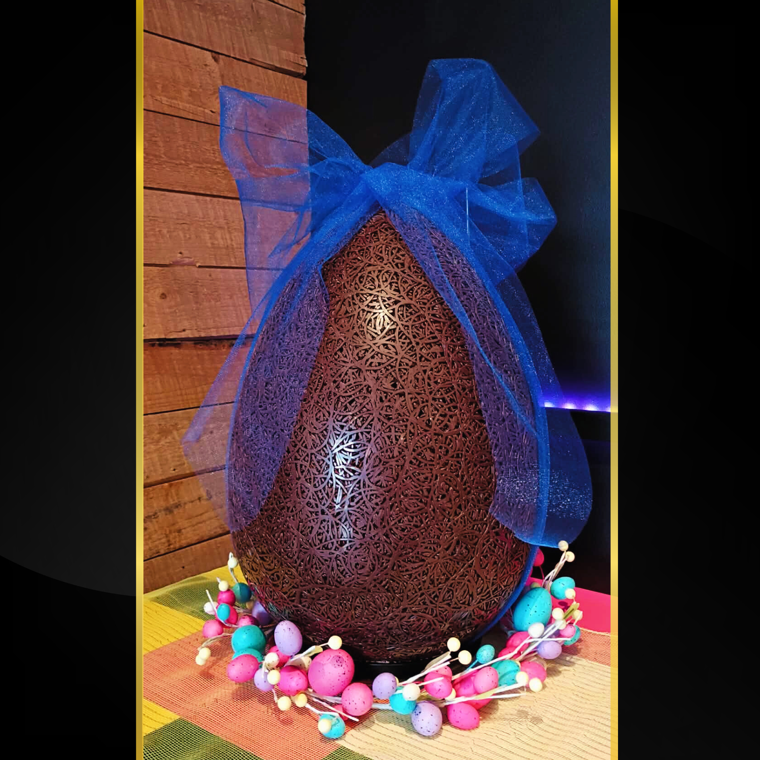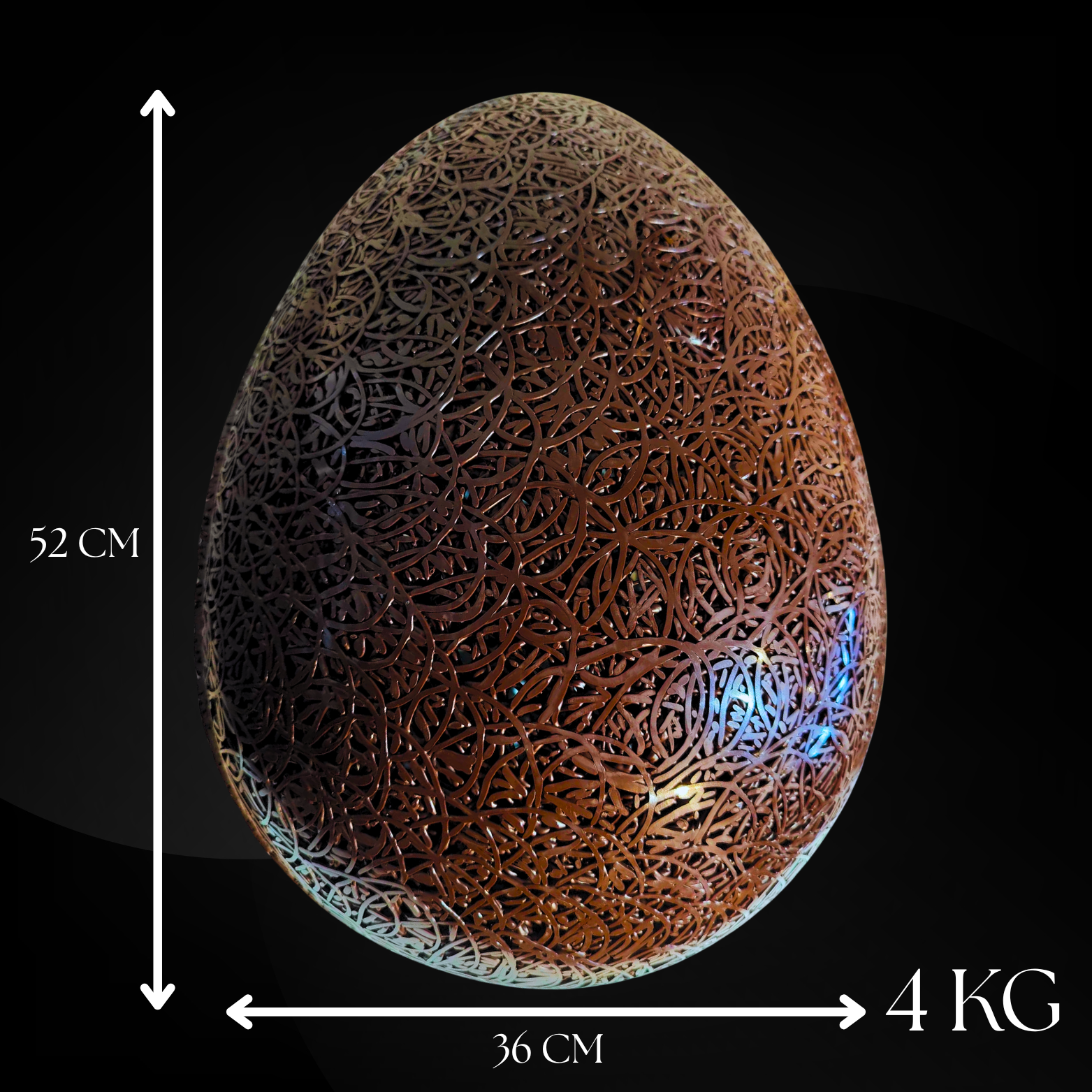 Une œuvre chocolatée de 4 kg, entièrement réalisée à la main dans notre atelier. Pensée pour impressionner autant par sa taille que par sa gourmandise, elle devient le centre d’attention de toute table de Pâques.